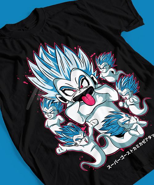 Diseño de la camiseta inspirado en el super Ataque Kamikaze de los 100 Fantasmas de Gotenks, de los personajes más poderosos dentro del universo de Dragon Ball Z.