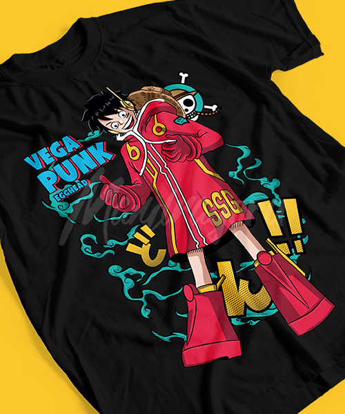 Diseño de la camiseta inspirado en el Arco de Egghead, parte final de la saga de la serie de anime One Piece, con el personaje de Luffy.