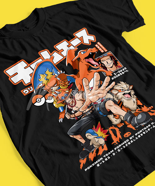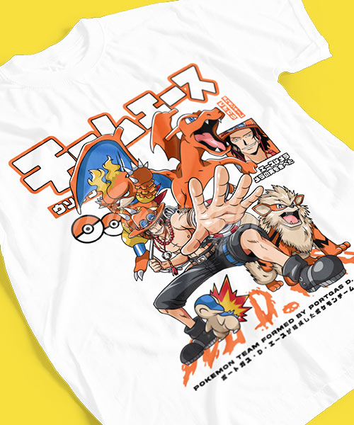 • Camiseta One Piece Portgas D. Ace con Pokémon.